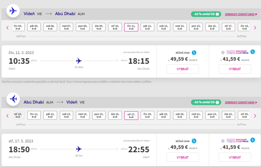 Na větší množství termínů ve druhé polovině května pořídíte zlevněné letenky z Vídně do hlavního města Spojených arabských emirátů. Zpáteční lety do Abú Dhabí stojí 99 EUR, členové věrnostního klubu WDC pal zaplatí 83 EUR.