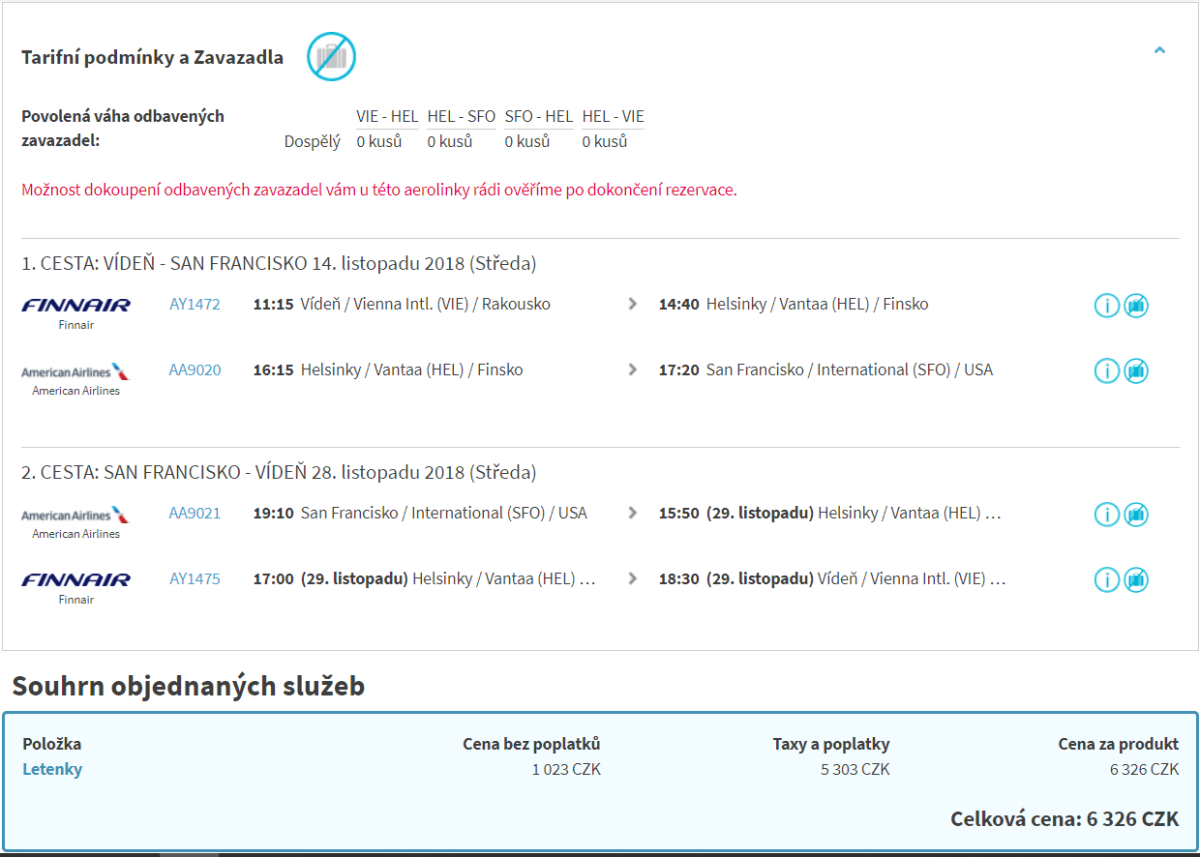 Pokud je váš let kombinací Finnair a American Airlines letů, musíte je dokoupit až na letišti. V opačném případě by to mělo být někde vidět. Nejjednodušší bude, když nám odpovíte na mail a mrkneme na to :)