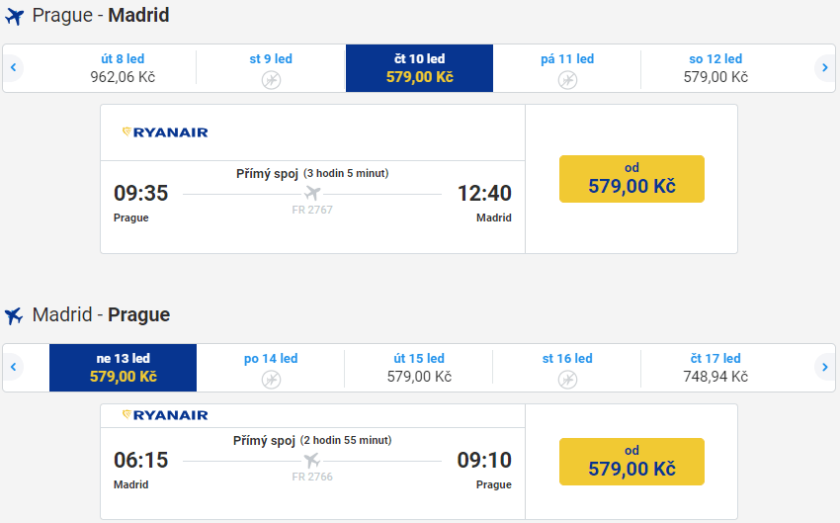 Akčních letenek do Madridu mnoho nebývá, proto uvítáme možnost letět rovnou z Prahy za skvělou cenu 1.158 Kč za zpáteční let na více termínů během ledna, včetně víkendových dní (čt-ne nebo so-út).