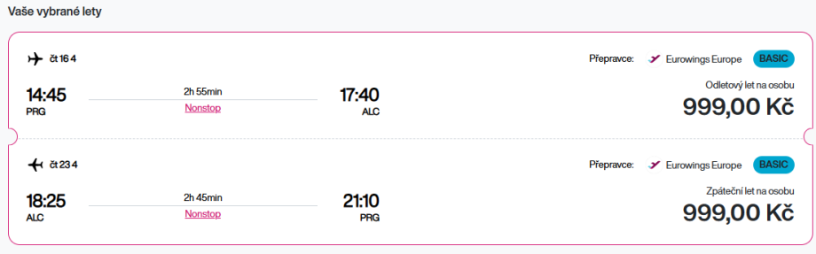 Zpáteční lety jsou k mání v rozmezí 1 998 Kč do 2 398 Kč.