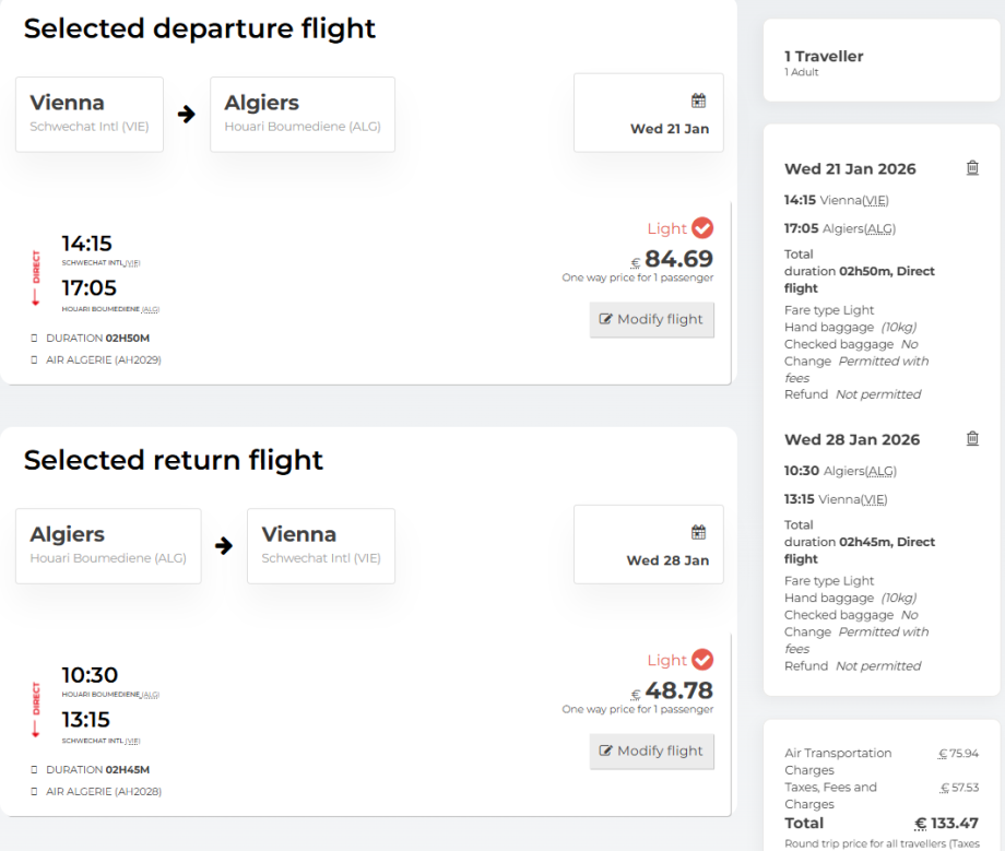Národní letecká společnost Alžírska Air Algérie má aktuálně akční nabídku přímých letů z Vídně do Alžíru. Zpáteční letenky pořídíte za 134 EUR na pravidelných linkách, které odlétají každou středu a sobotu.