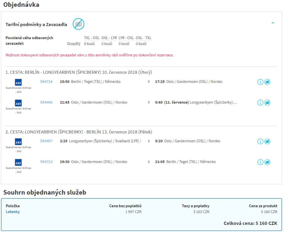V ceně letenky je příruční zavazadlo do 8 kg, v případě zájmu o cestu s odbaveným kufrem letenky kupte přes web SAS a vyberte rovnou dražší tarif "SAS Go", připlatíte si zhruba 2.200 Kč.