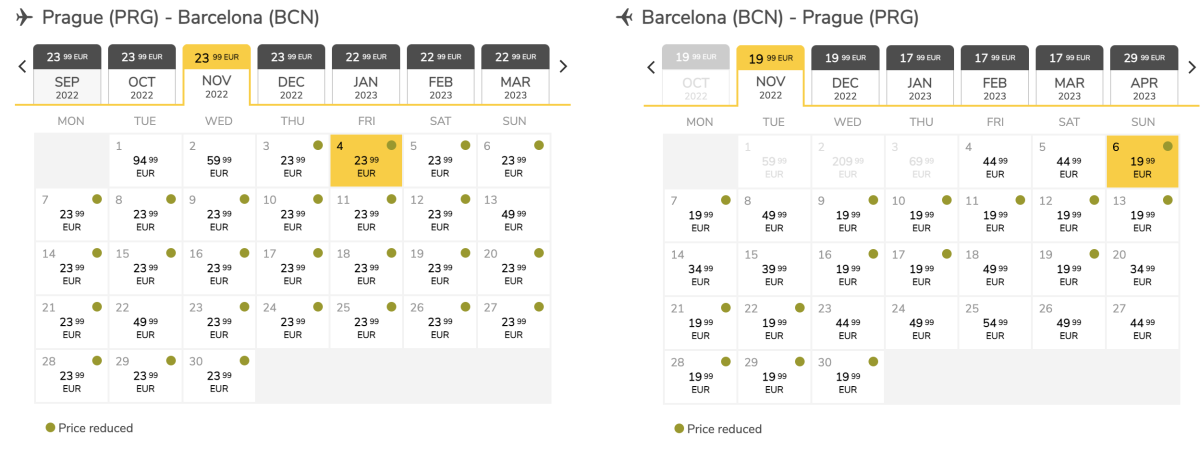 V rámci nepravidelných akcí se znovu objevily výhodné letenky z Prahy do Barcelony na křídlech španělských aerolinií Vueling. Zpáteční letenky po čas druhé poloviny roku od září do prosince pořídíte za 44 EUR. V nabídce jsou též lety na příští rok za 41 EUR, ale u těch na rozdíl od letošních pořídíte jen delší týdenní pobyty.