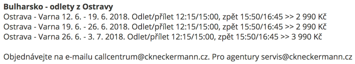 Letenky na týdenní termíny stojí 2 990 Kč s odletem a návratem vždy v úterý. Letenky objednávejte skrze e–mail callcentrum@ckneckermann.cz.