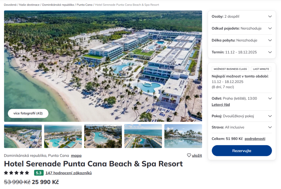 Týdenní pobyt v termínu 11.–19.12.  (odlet ve 13:00) s all-inclusive v oblíbeném 5* hotelu Serenade Punta Cana Beach & Spa Resort vychází na 25 990 Kč/os.