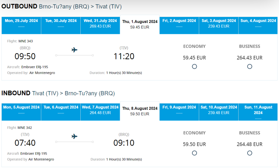 Aktuální dostupnost letenek je velmi dobrá na všech linkách. Zejména z Prahy do Tivatu jsou letenky za 119 EUR prakticky na všechny termíny. Z Brna a Ostravy je nejvíce levných letenek během srpna.