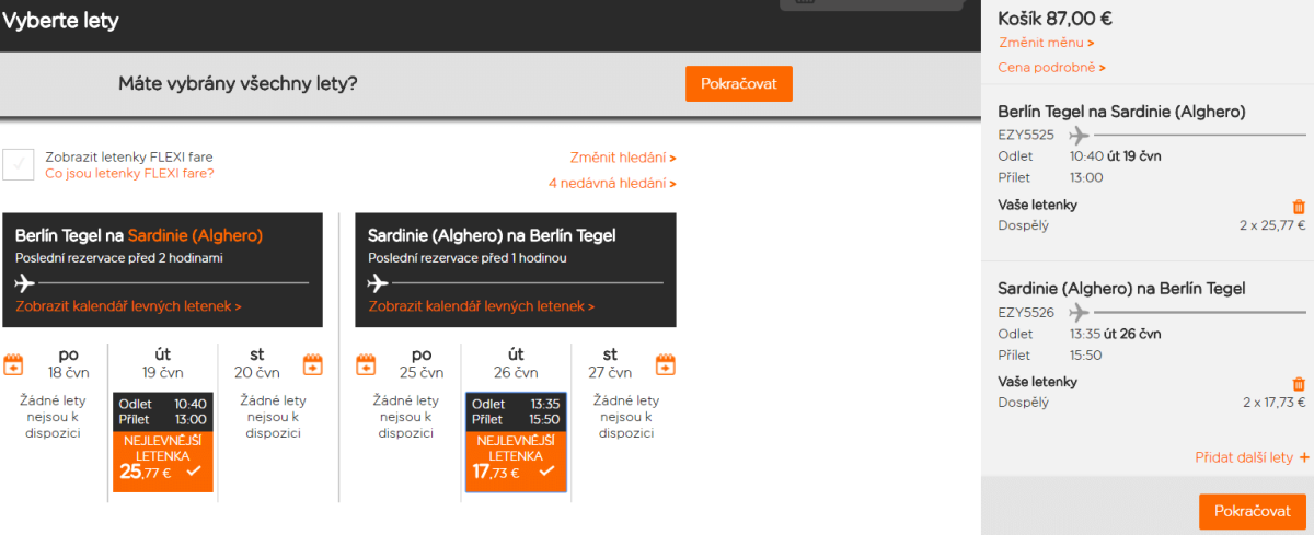 Druhý největší italský ostrov Sardinie bývá pravidelně označován za jedno z nejkrásnějších míst v celém Středomoří. Letenky z Česka se však stabilně pohybují v kdesi v nebeských výšinách, a tak si musíme pomoct cestou za hranice republiky. Kromě dražších nabídek Ryanairu z Bratislavy a Wizz Airu z Katovic upoutají ceny společnosti easyJet na lince z Berlína do Alghera na severozápadním pobřeží. Nejlevnější zpáteční letenky startují na 44 € / 1.140 Kč za jednu osobu při rezervaci 2 lidí. EasyJet rozpočítává administrativní poplatek mezi všechny cestující, čím více vás poletí, tím méně platíte.