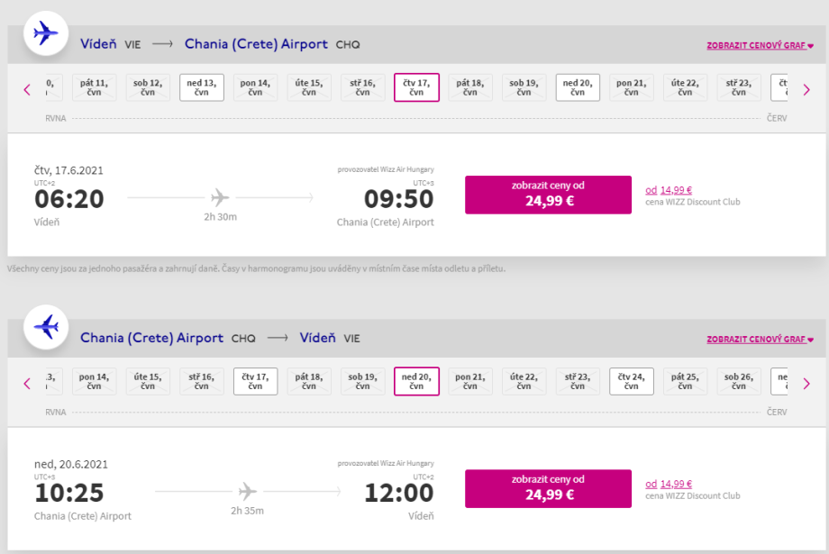 Nemůžete-li se dočkat cesty k moři a nedělá vám problém zajet na letiště do Vídně autem, zajímavou akci si připravila aeorlinka Wizz Air. Na červnové termíny, kdy už je na Krétě léto v plném proudu, nabízí zpáteční letenky na obě krétská letiště (Heraklion i Chania) od 50 EUR pro cestující bez členství ve věrnostním klubu.
