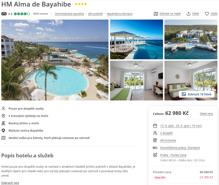 Cestovní kanceláře Fischer a Exim Tours nabízejí pobyt na 10 nocí (přílet na místo v 15:45, odlet zpět 22:20, tedy skutečně plných 10 dní) do letoviska Bayhibe poblíž Punta Cana v Dominikánské republice.