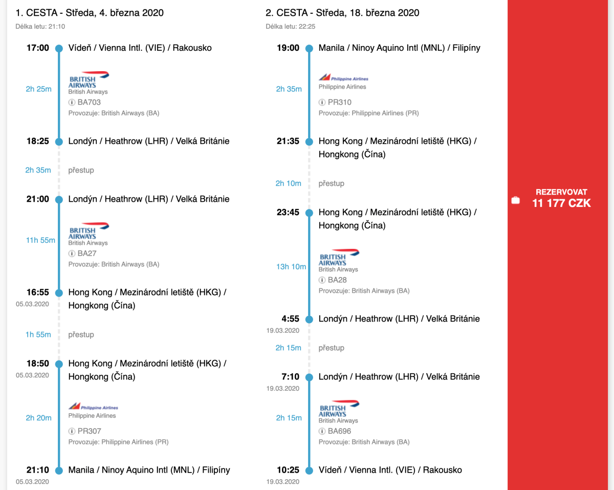 Dobrý den, můžete mi prosím poradit? Chceme s kámošem na začátku února letět na Filipíny s cca 2 denním stopoverem v HongKongu. Nedaří se mi však vyhledat ty levné letenky,. Když dám přímý let Vídeň - Manila, 5.2. - 2.3., tak tam jsou za 11488kč, ale s aspon 2 denním stopoverem v HongKongu na podobný termín to nevyhledá.