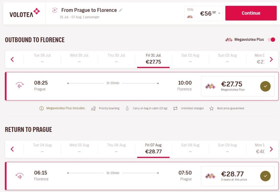 Nejlevnější zpáteční letenky na trase Praha – Florencie pořídíte na webu volotea.com od cca 1 402 Kč. K dispozici jsou především týdenní termíny během hlavní letní sezóny, nechybí však ani kratší pobyty nebo prodloužený víkend, například: