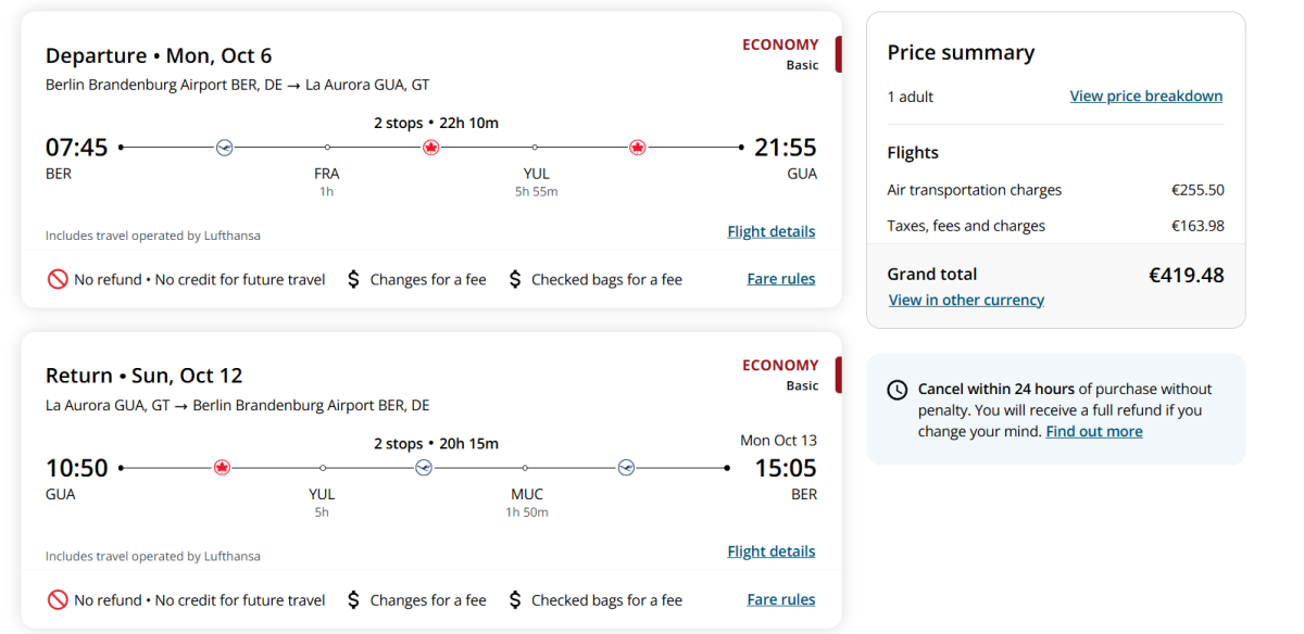 Výhodné letenky do Guatemaly se dvěma přestupy jsou k dispozici od října do března v rozmezí 420–435 EUR, a během dubna okolo 485 EUR. Lety do Belize začínají na částce 474 EUR a jsou operovány od 9. prosince do 10. dubna.