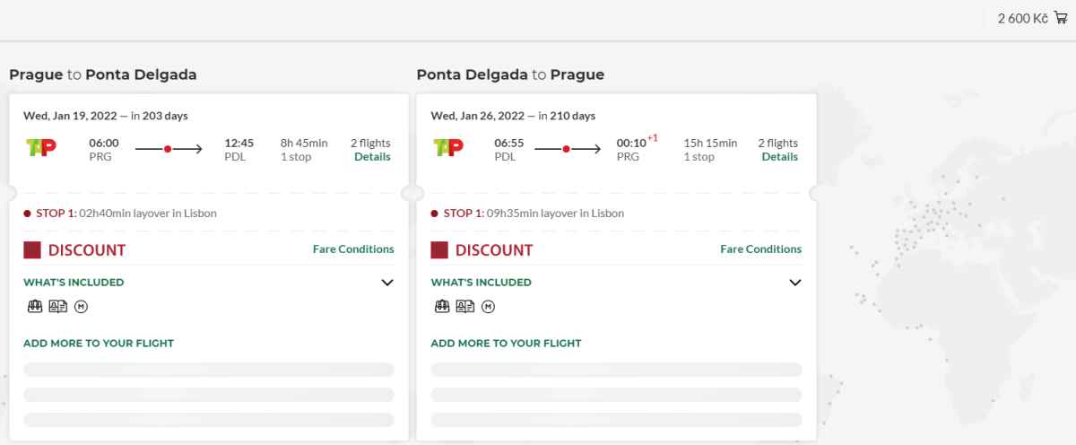 Kromě akce na Madeiru lze v rezervačním systému portugalských aerolinií pořídit za stejnou cenu i Azorské ostrovy. Zpáteční letenky z Prahy s přestupem v Lisabonu na azorský ostrov São Miguel pořídíte pouze za 2 600 Kč. Historicky nikdy tyto letenky nespadly ani pod 4 tisíce korun.