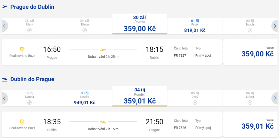 Po opravdu dlouhé době se objevují velmi levné zpáteční letenky z Prahy do irského hlavního města Dublin, a to i na prodloužené víkendy od čtvrtka do neděle či od pátku do pondělí. V termínu 8-11.10. je pak dostupný i čistokrevný víkendový termín s odletem v pátek večer a návratem v neděli večer. Koupit však samozřejmě můžete i delší termíny a vyrazit na cesty po Irsku. Letenky za parádních 718 Kč pořídíte zejména na říjnové termíny.