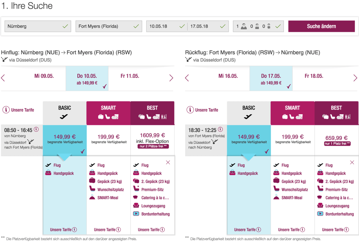 Během měsíců května, června, září a října jsou dostupné zpáteční letenky do amerického Fort Myers ležícího na jihozápadní straně Florida za 300 €, asi 7.690 Kč. Odlet je z bavorského Norimberku a dostupné jsou též o něco dražší letenky i z Drážďan.