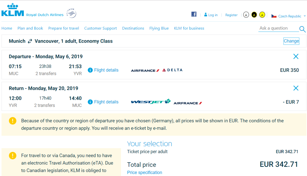 Po delší době se v našich sítích zachytily akční letenky do západní Kanady, a to i v období, které přeje horské turistice. Společnost KLM ve spolupráci s aerolinkami Delta a Westjet aktuálně nabízí zpáteční letenky z Mnichova do Vancouveru v rozmezí 343 až 356 EUR na celý květen s možným návratem i ve druhém červnovém týdnu. Běžné ceny ostatních aerolinek jsou přitom 2x tak vysoké.