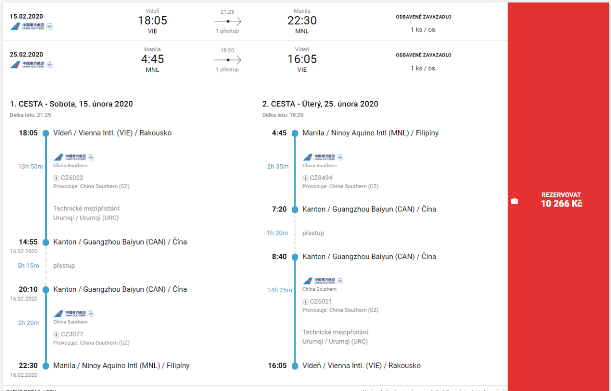 Pozorně čtěte! Itineráře těchto letenek zahrnují specifické lety z Vídně do Kantonu, u kterých budete absolvovat tzv. technické přistání, to proběhne v čínském Urumči, kde se zdržíte 2 hodiny a dále budete pokračovat stejným letadlem pod stejným číslem letu. Vaše budoucí letenka musí tedy obsahovat pouze lety CZ6022 z Vídně do Kantonu a z Kantonu do Vídně pouze CZ6021 na zpáteční cestě. V praxi tedy vybírejte jen lety s celkovou délkou 21 hodin 25 minut ve směr tam a 18 hodin 20 minut ve směru zpět. U všech letů musí být poznámka, že obsahují jen 1 přestup a po rozkliknutí nabídky tak 1 technické mezipřistání v obou směrech.