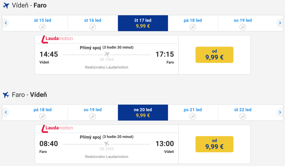 Skvělé ceny směrem na samotný jih Portugalska nabízí rakouské aerolinie Laudamotion při odletu z vídeňského leteckého přístavu. Zpáteční letenky zakoupíte po čas zimy za 20 €, asi 519 Kč. Výhodou jsou i termíny na prodloužený víkend od čtvrtka do neděle.
