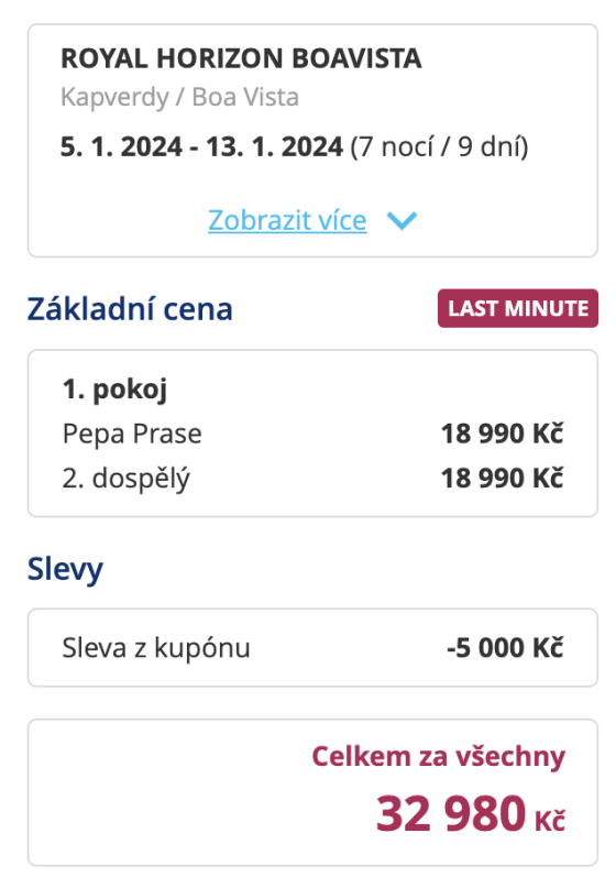 Kapverdy nabízí hned z počátku roku přívětivé ceny od 18 990 Kč do 4* resortů s all-inclusive na poklidném ostrově Boa Vista. Společně s uvedenou slevou při cestě 2 dospělých tak dosáhnete na částku 16 490 Kč, která je nižší než řada last-minute termínů.