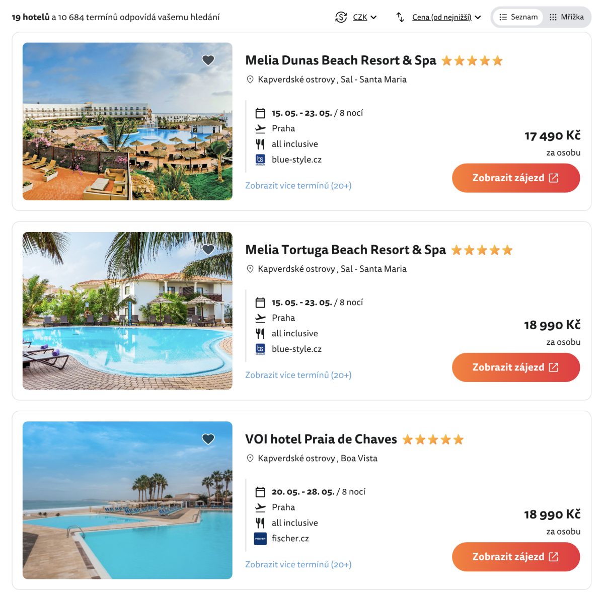 Výhodou je dostupnost v průběhu května, kdy na vícero termínů pořídíte vybrané hotely za +- stejnou cenu, viz přehled nejlevnější all-inclusive dovolené na Kapverdách.