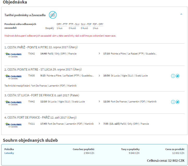 - V ceně je Odbavené zavazadlo do 23 kg je zdarma na letech z/do Paříže. U trasy Guadeloupe – Sv. Lucie – Martinik se kufr zpoplatní 15 € za let, celkem tedy 30 €.