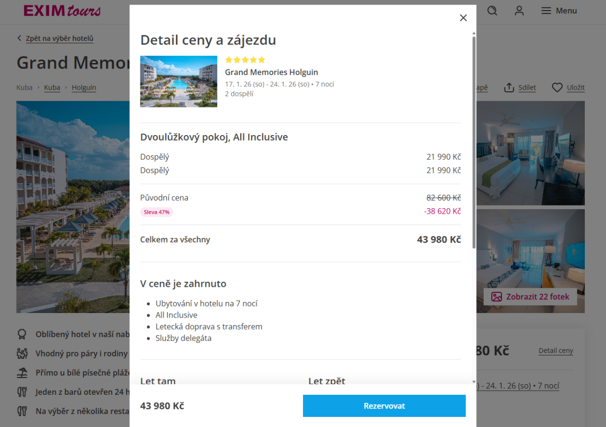 Ubytování je zajištěno v pětihvězdičkovém resortu Grand Memories Holguin s all-inclusive a součástí balíčku je přímý let z Prahy.