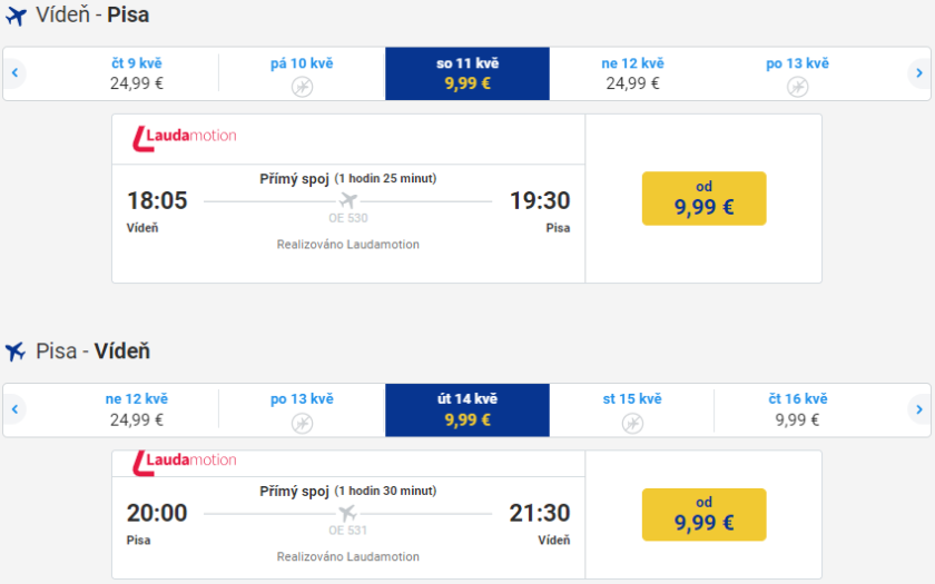 Nejen k návštěvě ikonické šikmé věže lákají májové letenky Laudamotion z Vídně do toskánské Pisy. Více než přívětivá cenovka pyšnící se hodnotou 20 EUR za zpáteční let nenechá nikoho na pochybách. Pisa samozřejmě není jen o šikmé věži, poslouží jako ideální základna pro výlety do okolí. Města jako Florencie, Lucca nebo Siena jsou vzdálené do 2 hodin jízdy vlakem. Jízdenky na regionální spoje přitom stačí kupovat vždy až na místě, časy odjezdů pak zkontrolujete na webu trenitalia.com.
