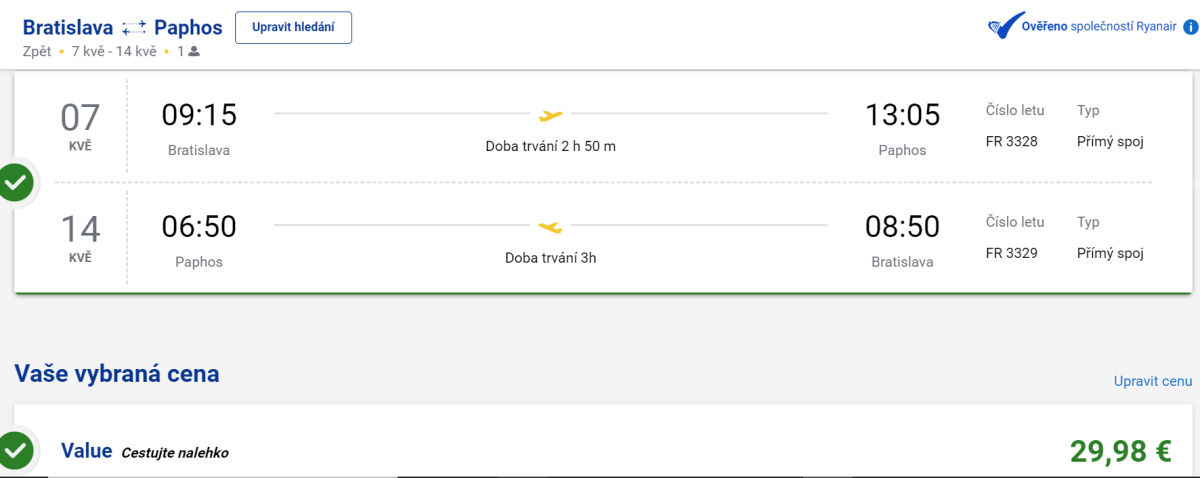 Na několik termínů během května i dubna pořídíte akční letenky z Bratislavy na kyperské letiště Paphos ležící na západním pobřeží ostrova za 29 EUR. Na dubnový termín 26. - 30.4. zakoupíte letenky dokonce jen za 26 EUR.