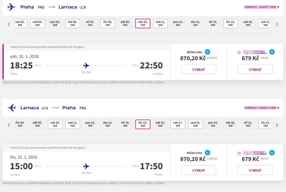 Zpáteční letenky z Prahy do Larnaky pořídíte za 1 740 Kč, členové WDC za 1 358 Kč. Letenky za tyto ceny jsou dostupné v termínech od ledna do března.