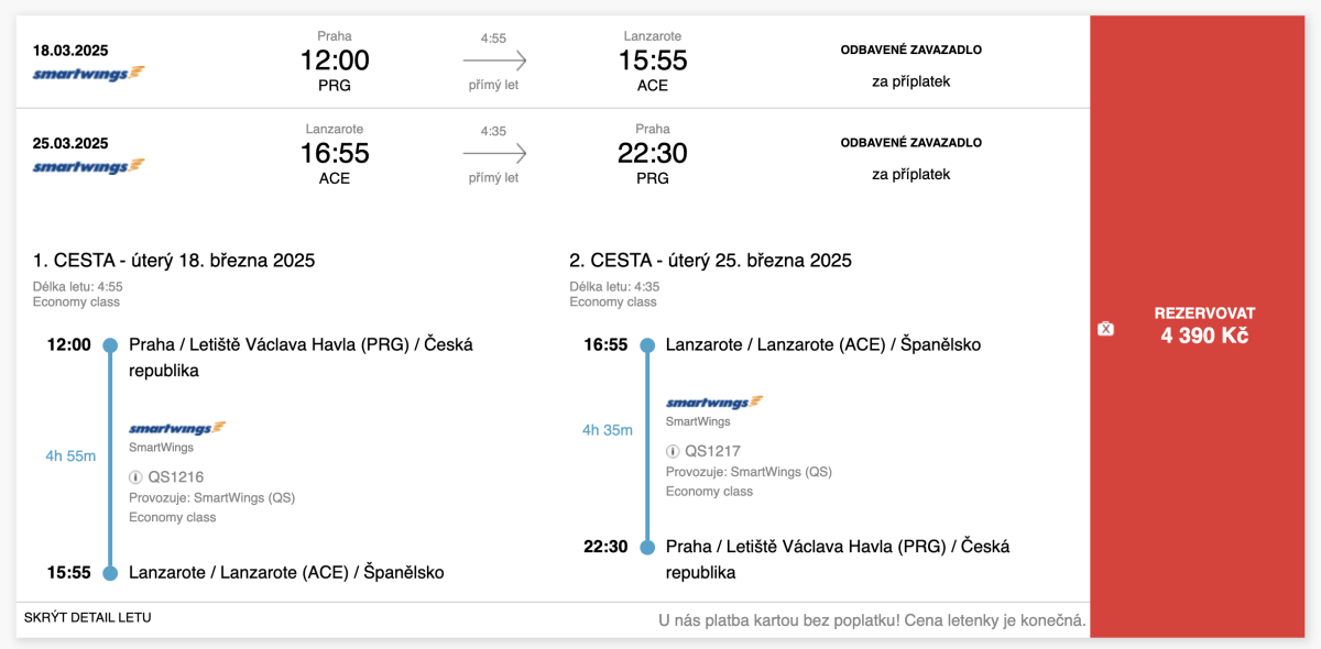 Nejlevnější letenky na Kanárské ostrovy přímým letem aktuálně zakoupíte konkrétně na ostrov Lanzarote. Zpáteční letenky z Prahy vás vyjdou na 4 390 Kč, a to v průběhu celého března vždy od úterý do úterý.