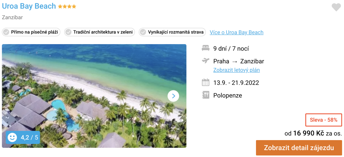 Pondělní klasika v podobě last-minute výprodejů směrem na tanzanský Zanzibar je opět k dispozici za nejnižší cenu. Zájezd s ubytováním v 4* hotelu Uroa Bay včetně polopenze zakoupíte s odletem zítra v poledne za 16 990 Kč. Součástí je místo na přímém letu širokotrupým letadlem Boeing 787-900 Dreamliner.