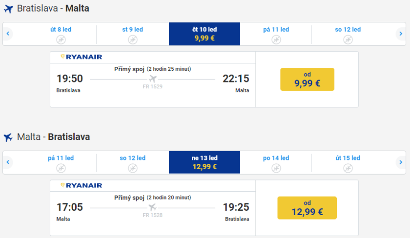 Na ideální termíny od čtvrtka do neděle se skvělými časy (odlety vždy večer/odpoledne) láká Ryanair při odletu z Bratislavy za jednu z historicky nejnižších cen na této trase: 23 € / 594 Kč za zpáteční cestu! Dostupný je dokonce ještě o 3 € levnější týdenní termín. K parádní ceně za letenku si připočtěte ještě nízké mimosezónní ceny ubytování a vyjde vám levná dovolená na krásném místě, kterou vám pomůže naplánovat náš průvodce po Maltě.
