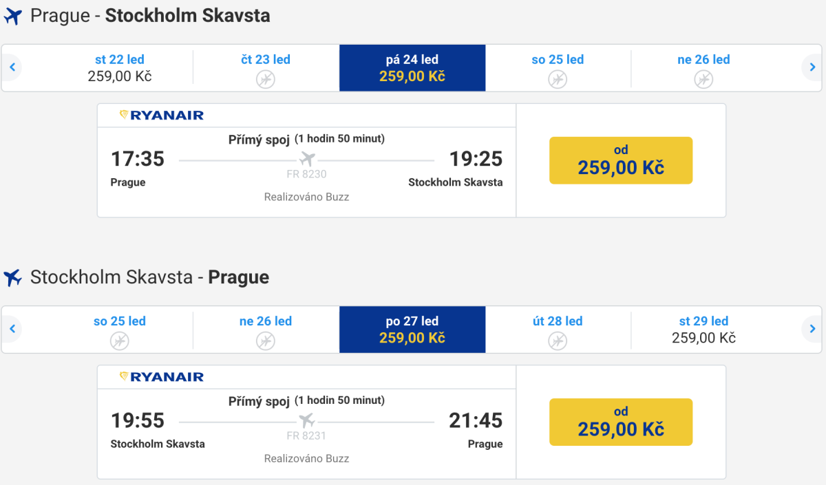 Termínů je aktuálně dostatek a cena 259 Kč svítí na libovolný termín v průběhu ledna a namátkově i v prosinci či únoru.