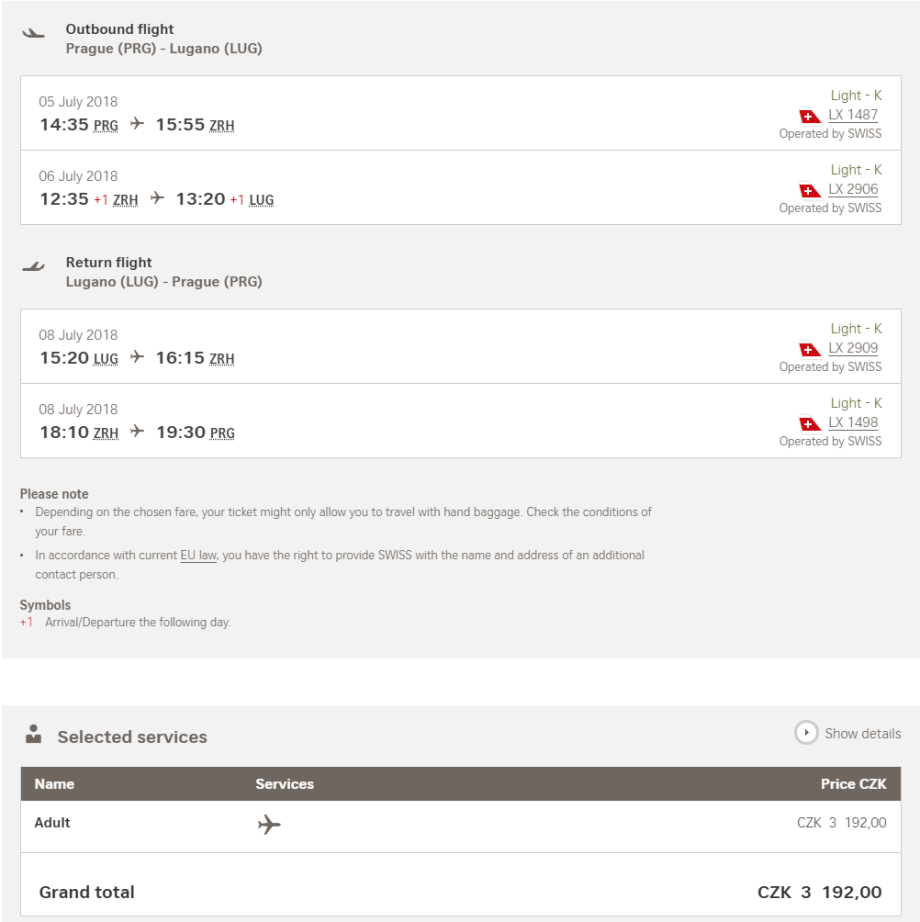 Rezervaci letenek provádějte přímo na webu letecké společnosti. Chcete-li do itineráře vložit zastávku v Curychu, zvolte ve vyhledávacím formuláři Advanced search a dále možnost Multi segment journey / Open jaw flights a zadejte celkem tři segmenty. Je nutné dodržet maximálně 24 hodinovou přestávku v Curychu, jinak se letenka bude kalkulovat dle jiného a dražšího tarifu.