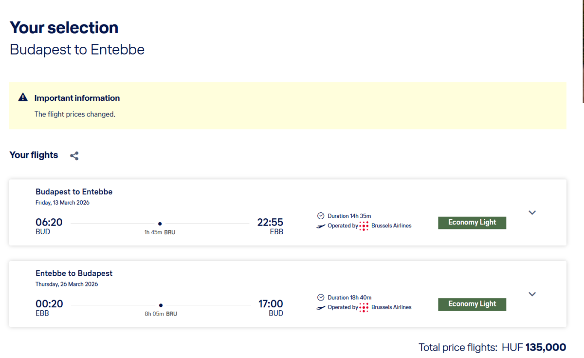 Cestou do Ugandy Vás čeká jeden krátký přestup v Bruselu a následně taktéž hodinové mezipřistání ve Rwandě. Zde ovšem nevystupujete z letadla. Cesta zpět je svižnější s non-stop letem z Entebbe do Bruselu.