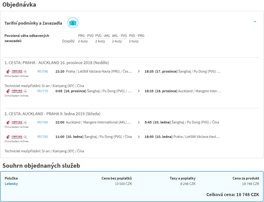 Se zajímavou nabídkou se při pátečním odpoledni vytasila společnost China Eastern Airlines. Na vrcholnou sezonu totiž nabízí letenky z Prahy do novozélandského Aucklandu za 18.748 Kč, což je o víc než 10 tisíc korun méně než druhá nejlevnější nabídka. Nabídka je o to lepší, že zahrnuje termíny přes Vánoce i Nový rok najednou, navíc vychází dobře i relativně krátké (cca 5 hodinové) přestupy v Šanghaji.