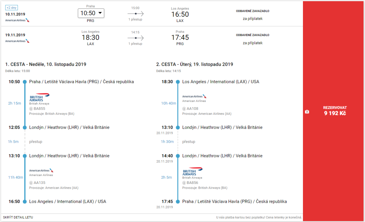 Po dlouhých letech levných letenek do Los Angeles z Německa nebo Vídně se konečně pod hranicí 10 tisíc Kč ustálily letenky i z Prahy. Ačkoliv se v minulých měsících objevila ještě o pár stovek výhodnější nabídka, stále platí, že letenky z Prahy na západ USA za 9 192 Kč jsou velmi dobrou nabídkou a kdo plánuje cestu do Kalifornie, aktuálně lepší cenu nenajde. Je navíc otázkou, jak dlouho podobné ceny z Prahy vydrží...
