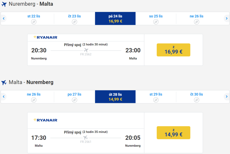 Letenky z Norimberka zajistí společnost Ryanair od 32 € / 830 Kč při pobytu od pátku do úterý, a sice na vybrané termíny během listopadu a ledna. Nejlevnější termíny: