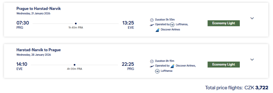 Zpáteční letenky z Prahy na letiště Harstad–Narvik pořídíte za ceny kolem 3 700 Kč.