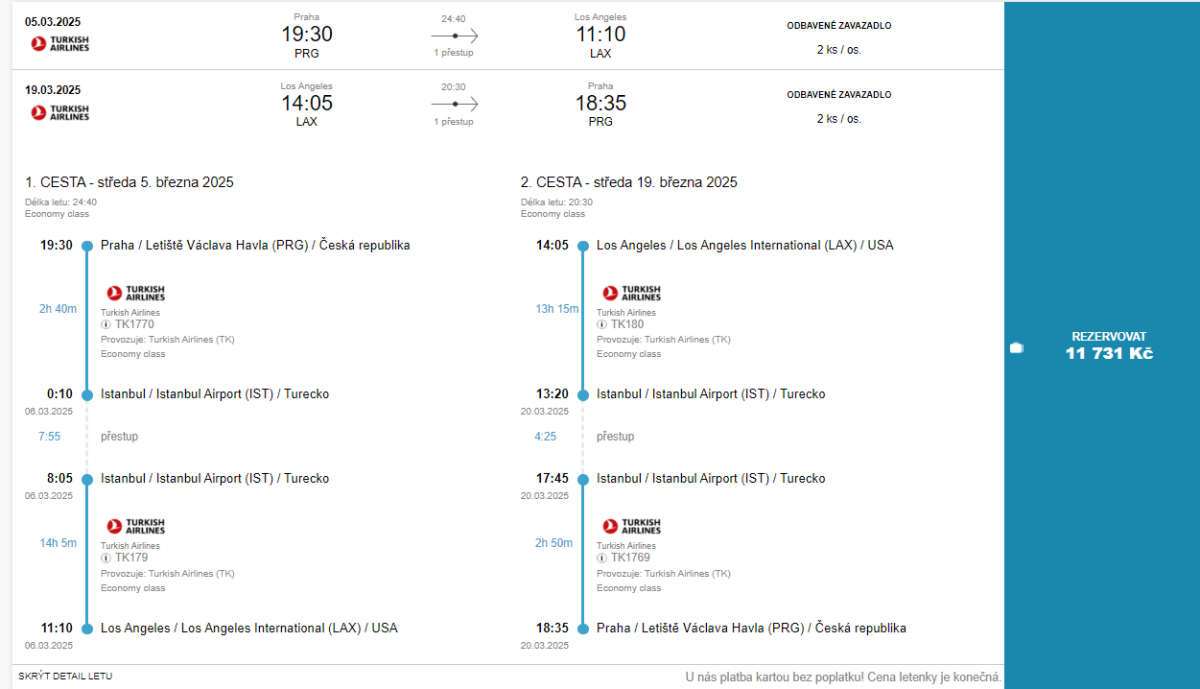 Ve směru do USA vás vždy čeká noční přestupu v Istanbulu. Za příplatek cca 500 Kč si však formou multicity letenky můžete nastavit až dvoudenní stopover v Istanbulu. V našem vyhledávači si můžete jednoduše navolit 3 lety: Praha - Istanbul, Istanbul - Los Angeles a Los Angeles - Praha