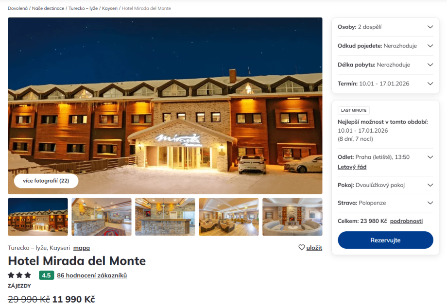 Nejlevnější termín je 10.–17.1., kdy zájezd vychází na 11 990 Kč za osobu