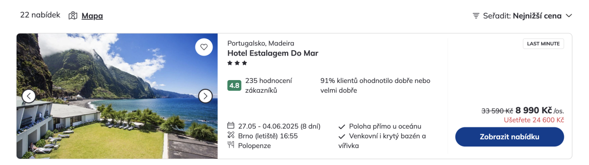 Prohledej náš srovnávač zájezdů na Madeiru a podívej se na další hotely a termíny z Prahy i Brna.