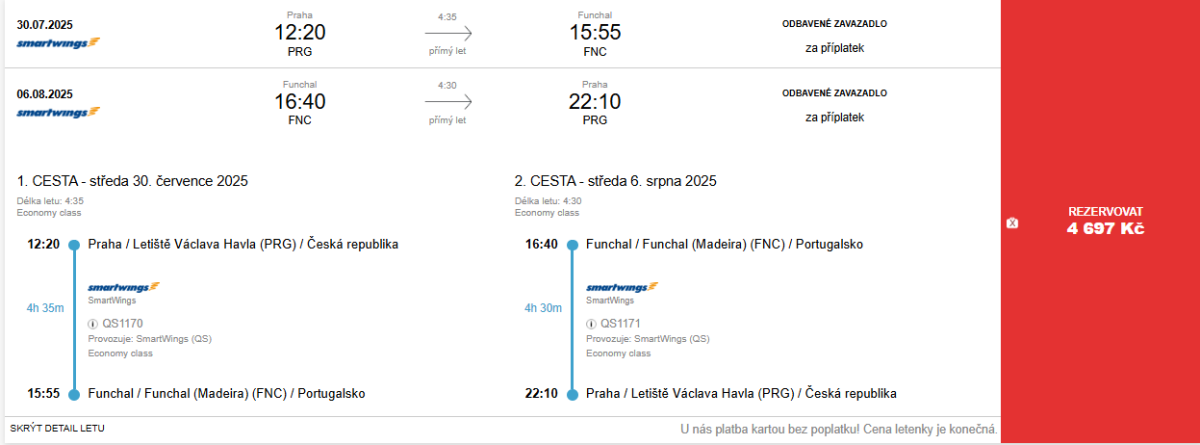 Smartwings na několik prázdninových termínů nasazují velmi atraktivní cenovku za zpáteční přímé lety z Prahy na Madeiru mezi 4 700 Kč a 5 500 Kč.