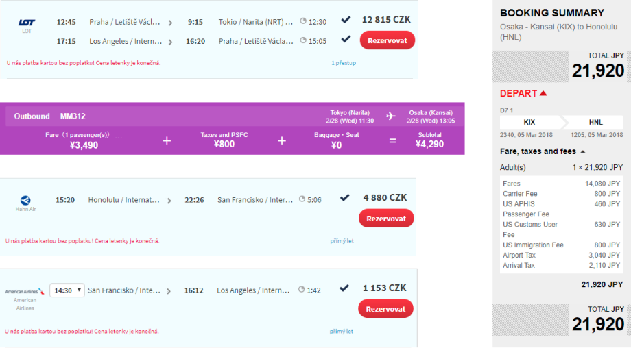 K tomuto itineráři budete potřebovat celkem pět letenek. Celkově vydáte za letenky 24 113 Kč (dle aktuálního kurzu).