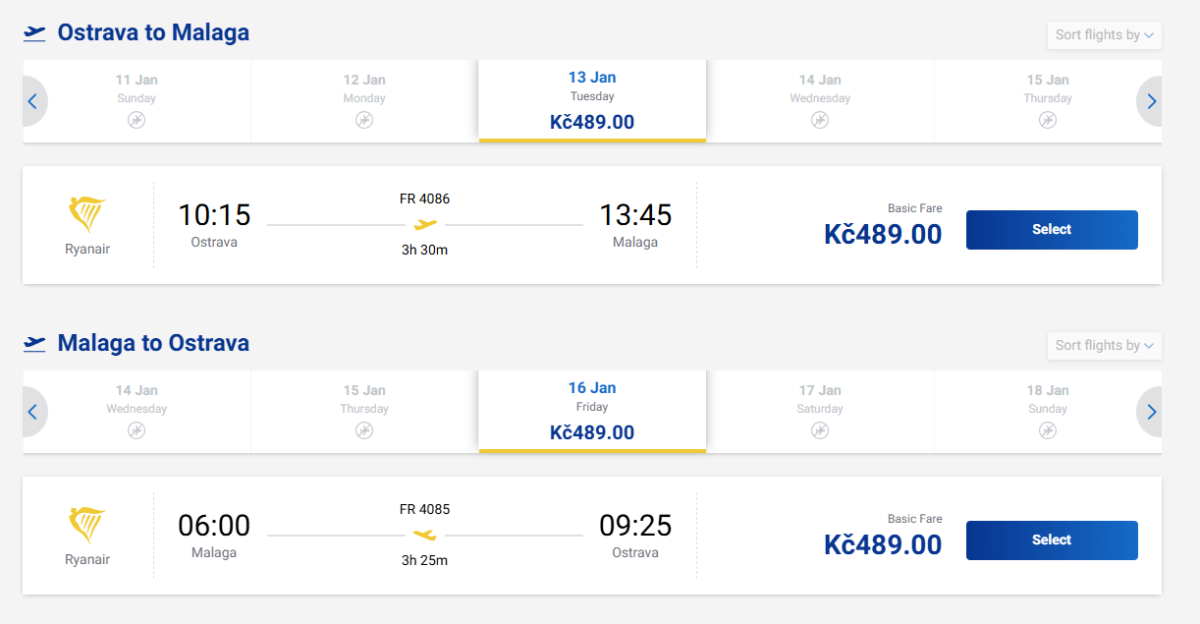 Ryanair nabízí v lednu zpáteční lety z Ostravy do Málagy, a to jak na kratší pobyty, tak na týdenní termíny. Např.: