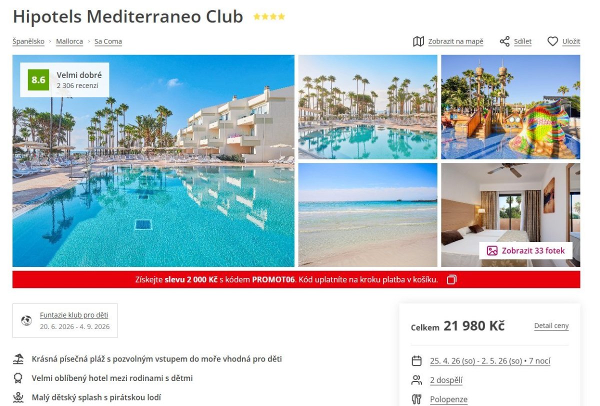 Cestovní kanceláře Exim Tours a Fischer nabízejí výhodný zájezd na Mallorcu do dobře hodnoceného hotelu Hipotels Mediterraneo Club ****, který se nachází přímo u krásné dlouhé písečné pláže.