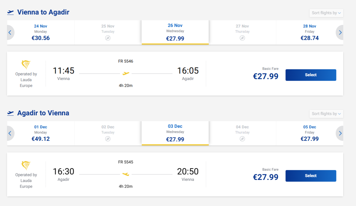 Letecká společnost Ryanair nabízí během zimních měsíců výhodné zpáteční letenky z Vídně do marockého Agadiru za 56 EUR. Dostatek termínů najdete koncem listopadu a v průběhu prosince.