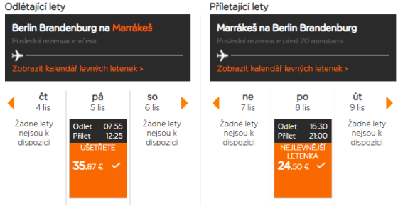 Přímou linku z Prahy do Marrákeše Ryanair zatím obnovit neplánuje, a tak nejlevnější možností, jak se do Maroka dostat, je letět z okolních letišť. Aktuálně nejnižší ceny na velké množství podzimních termínů (včetně dlouhých prodloužených víkendů od pátku do pondělí) nabízí aerolinie easyJet právě do Marrákeše. Zpáteční letenky zakoupíte 60 EUR.