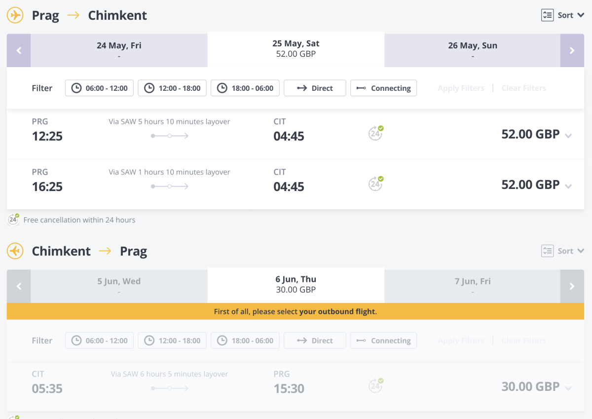 Nemohu najít lety do Astany..