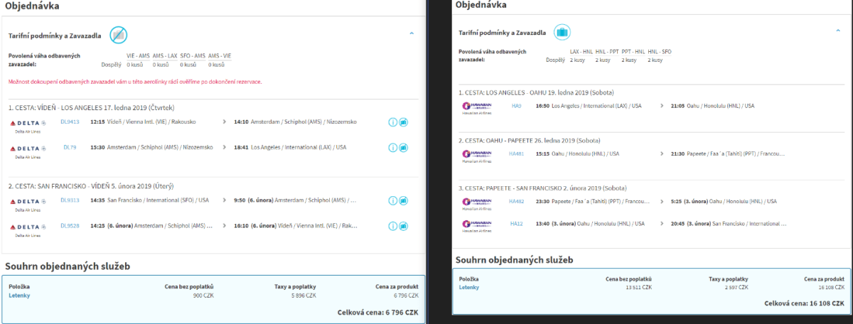 Při cestě z Vídně do Kalifornie a zpět využijete letenek, o kterých jsme informovali již dříve. Pamatujte, že obsahují jen příruční zavazadlo, což ale v teplých krajích Pacifiku bude stačit. A pokud ne, odbavené dokoupíte později na webu aerolinek za 50 € jedním směrem. Z USA přes Havaj do Polynésie pak využijete akční nabídky Hawaiian Airlines za 16.108 Kč, tedy o polovičku méně než o obvykle.